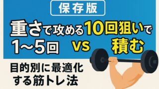 スポーツ【保存版】“重さで攻める1〜5回”vs“10回狙いで積む”——目的別に最適化する筋トレ法 ※本記事にはPR/アフィリエイト広告が含まれます 【保存版】“重さで攻める1〜5回”vs“10回狙いで積む”——目的別に最適化する筋トレ法 結論:筋力最大化は高重量・低回数(1–5回)、筋肥大最大化は中重量・中回数(6–12回)を中心に。週... 2025.08.26スポーツ筋トレ