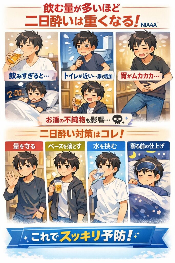 • 飲む量が多いほど二日酔いは重くなりやすい(飲み順より量)NIAAA