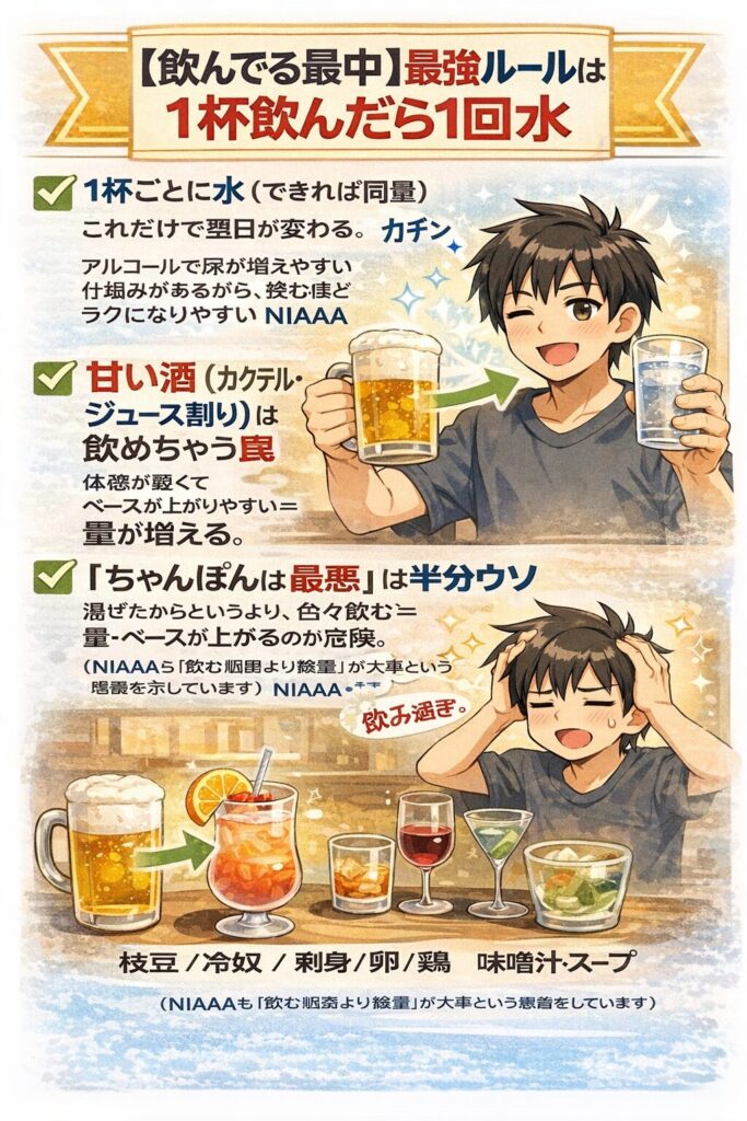 ② 1杯ごとに水を挟む(脱水を作らない)NIAAA
