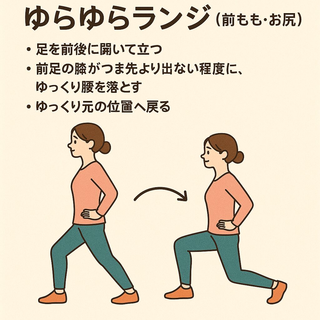 - 前足の膝がつま先より出ない程度に、ゆっくり腰を落とす
