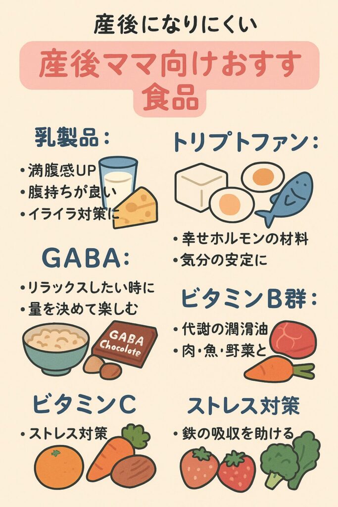 - 授乳中のママにおすすめの【食材・栄養(乳製品・トリプトファン・GABA・ビタミンB群・Cなど)】