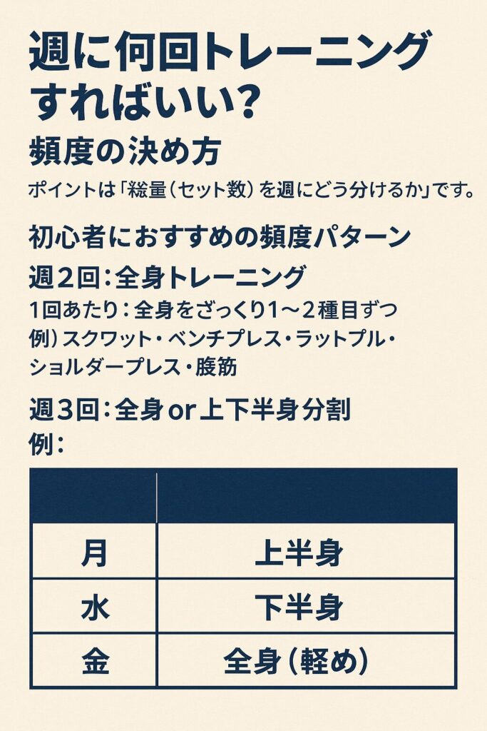 - トレーニング頻度:週2〜3回(全身 or 上下半身分割)
