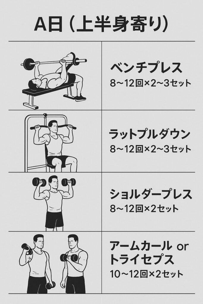 - 例)スクワット・ベンチプレス・ラットプル・ショルダープレス・腹筋