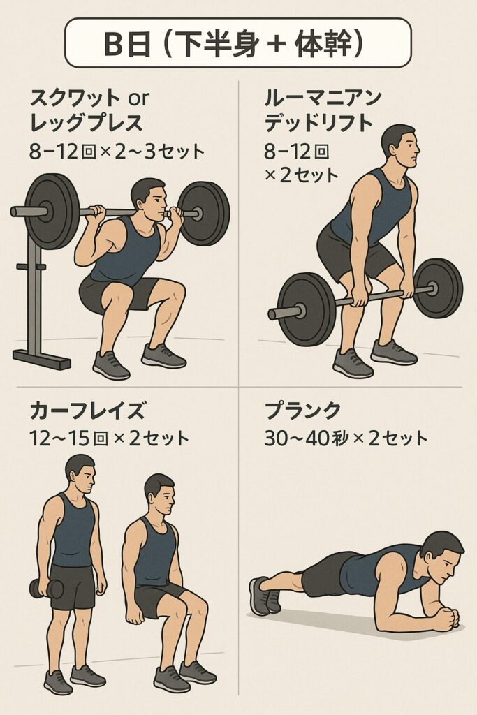 - スクワット or レッグプレス:8〜12回×2〜3セット