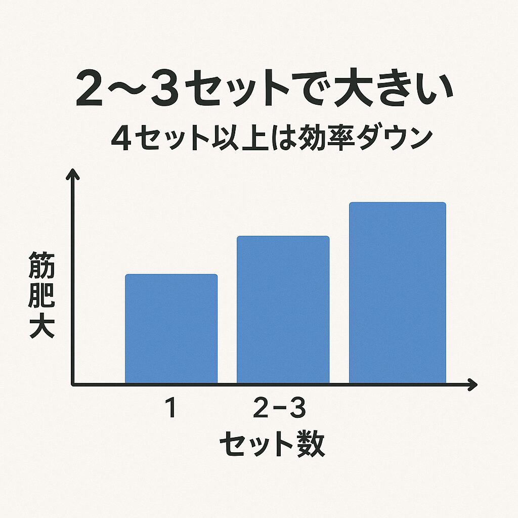 「もっとやればもっとデカくなるんじゃ?」と考えがちですが、3セットを超えたあたりからしんどさの割にリターンが少ない領域に入りやすい、というのが今のエビデンスのイメージです。