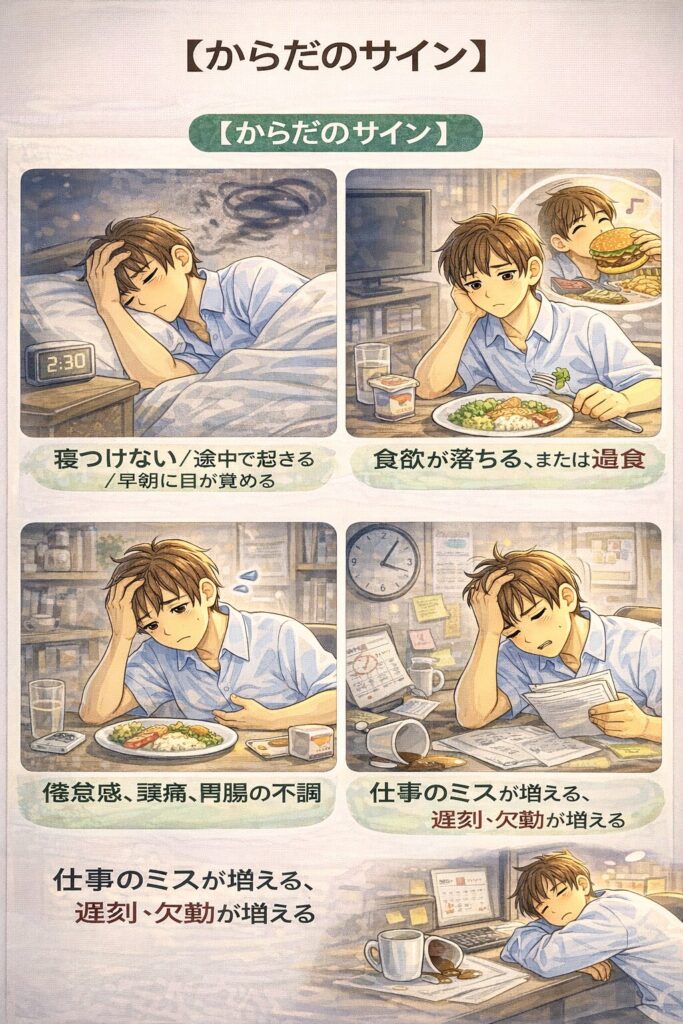 - 仕事のミスが増える、遅刻・欠勤が増える